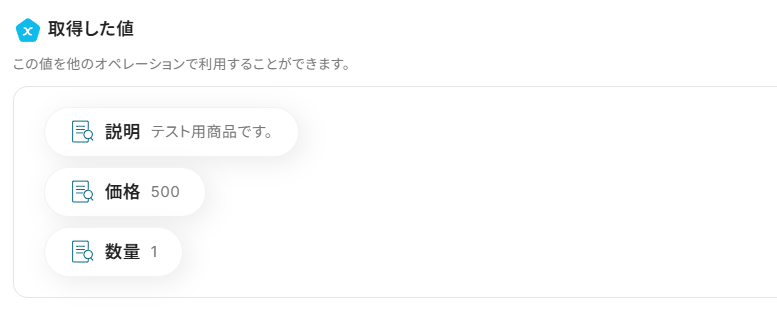 入力できたら「テスト」を押して、項目が理想通りの形で抽出されているか確認してください。抽出された内容は、取得した値として表示されます。