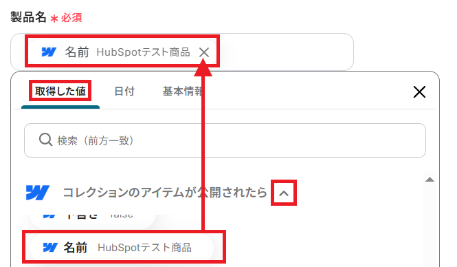 まずは必須項目となっている「製品名」を設定していきましょう。Webflowから取得した値を使って、以下のように設定してください。