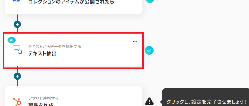 Webflowに新しく公開されたアイテムをYoomが検知したら、テキスト抽出機能を使ってHubSpotに連携させるための必要な情報を取得していきましょう。