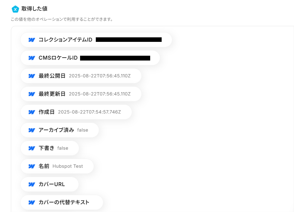 取得した値を使うことによって、今後新たにWebflowでアイテムが作成される度に、値の内容が更新されていきます。
