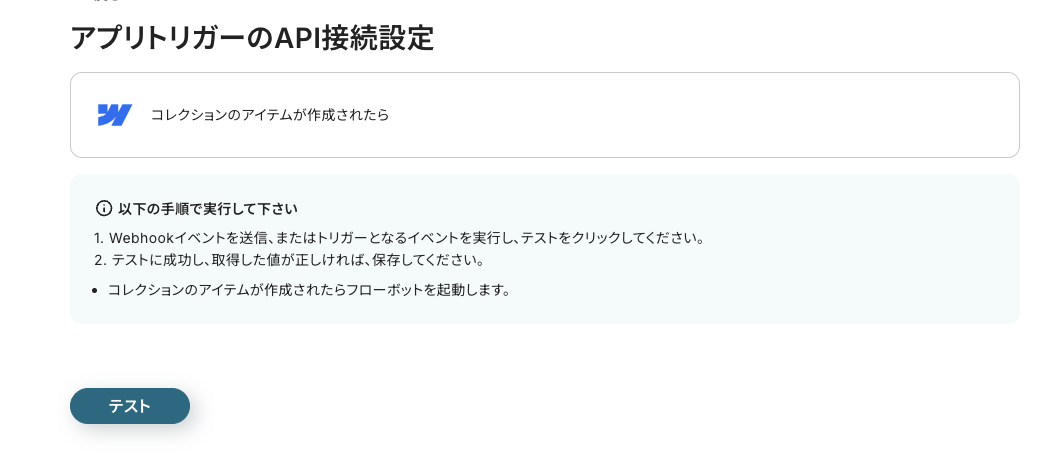 次の画面に進んだらフローボットの起動条件となるイベント(指定したサイトにアイテムを実際に追加するアクション)を実行し、[テスト]をクリックします。