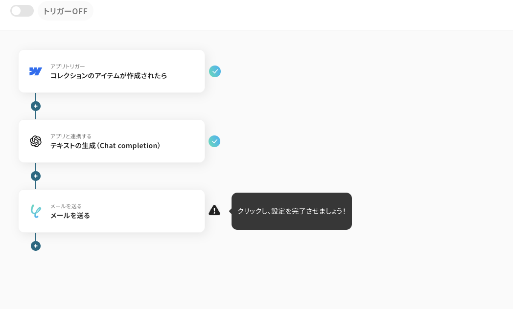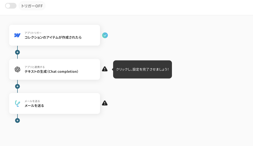 - Webflowのトリガー設定およびOpenAIの設定、続くメール送信の各アクションの設定