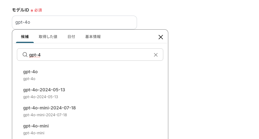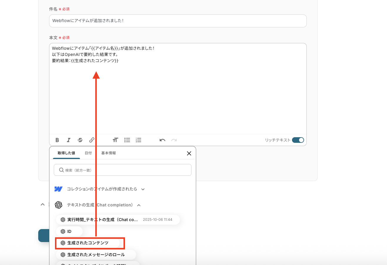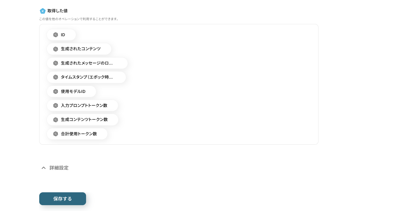 なお、OpenAIでテキスト生成を行う際プロンプトなどに取り込みたいデータや、メール送信の際に使用したいデータが取得できていない場合、こちらのページに記載されている操作を参考に取得した値の追加を行ってください。
