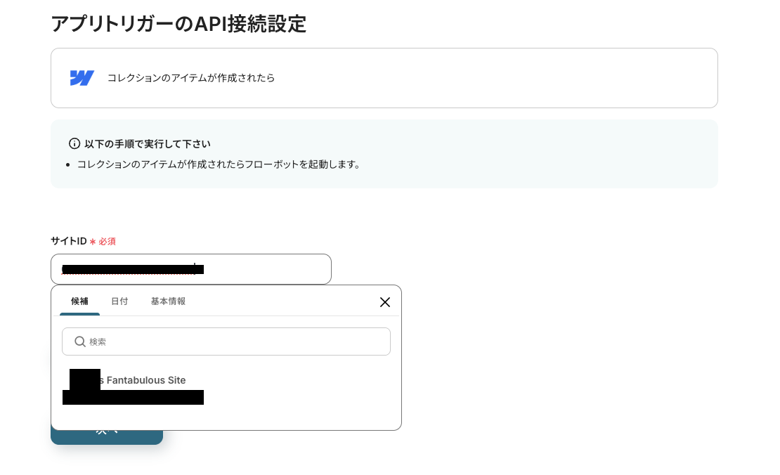 「サイトID」は、入力バーをクリックすると『候補』に連携したアカウントに基づいた情報が表示されます。ここから今回の連携で使用するサイトIDを選択しましょう。