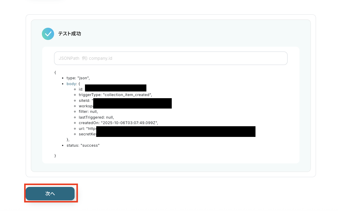 情報を設定した後、[テスト]を押しましょう。テストに成功すると、以下の値を取得できます。