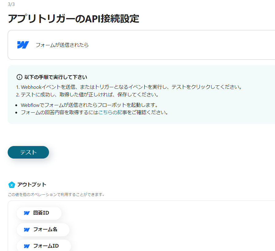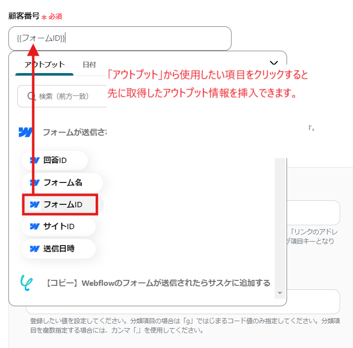 アプリ登録ができていると、Webflowのアウトプット情報を活用し、必要に応じて候補から選択して入力します。