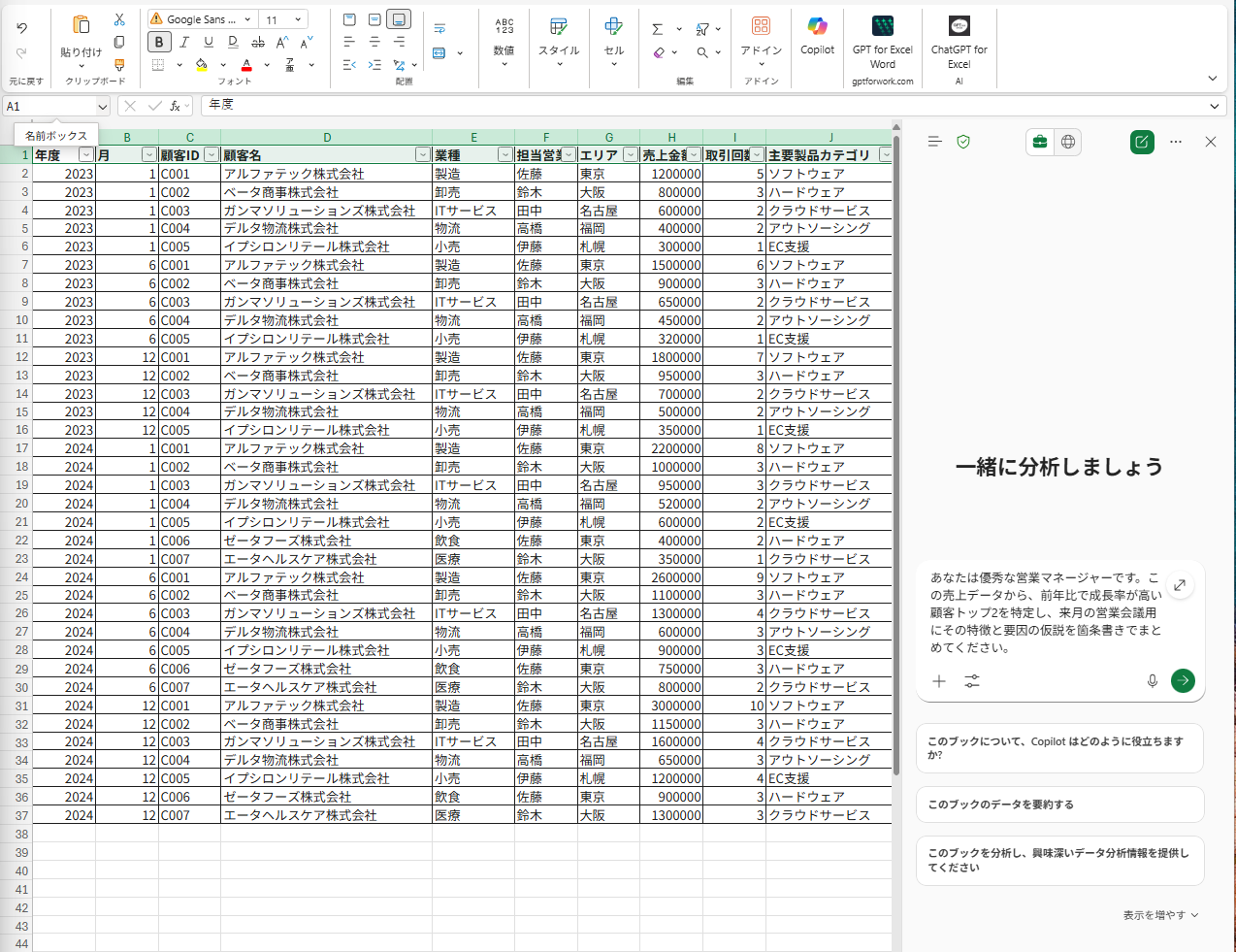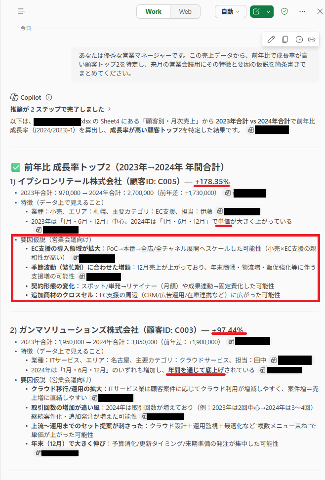 あなたは優秀な営業マネージャーです。この売上データから、前年比で成長率が高い顧客トップ2を特定し、来月の営業会議用にその特徴と要因の仮説を箇条書きでまとめてください。