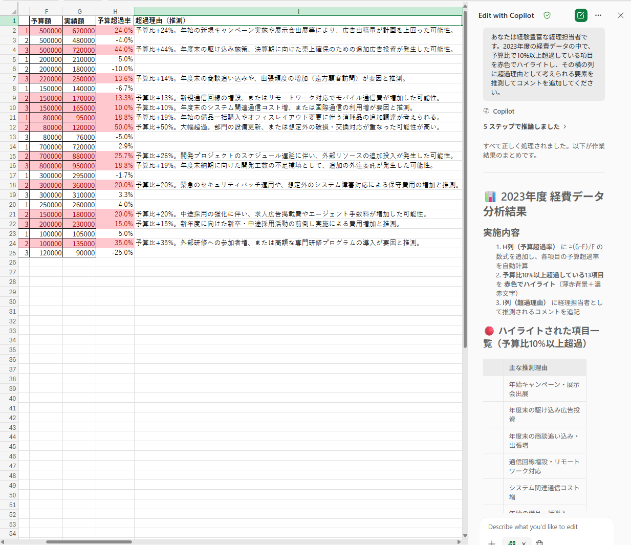 さらに、予算比10%以上の超過項目を赤色でハイライトするといった視覚的な装飾も自然言語の指示のみで完結するため、会議用の見やすい資料作成にも非常に便利です。