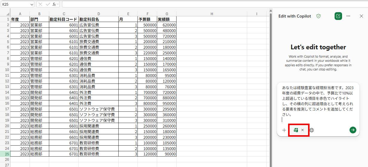 そこで、予実データが入力されたシートを用意し、予算を大きく超過している項目の特定と、その理由の推測をAIに依頼する検証を行いました。