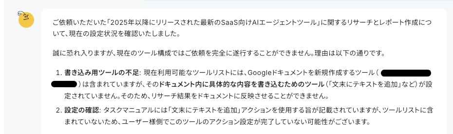 AIワーカーの設定(アプリの詳細設定など)に不備があると、このように表示されます。
