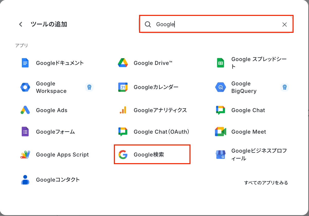「+ツールを追加」から、Google検索を検索して追加します。