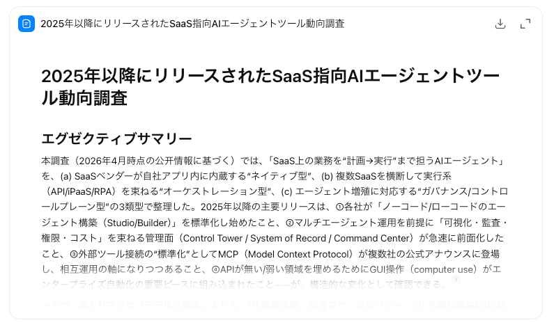 精度面でも、両者ともに2025年以降の情報を正確に捉えていますが、Deep Researchが「じっくり深掘りする専門調査員」だとすれば、AIワーカーは「手順通りに報告書を書き上げる社員」として機能します。
