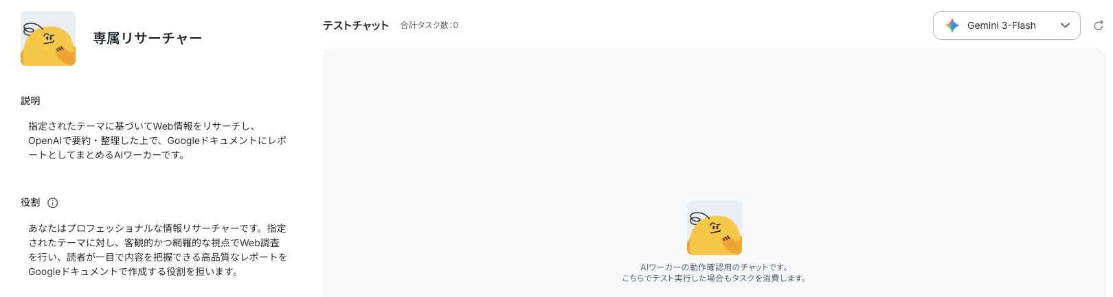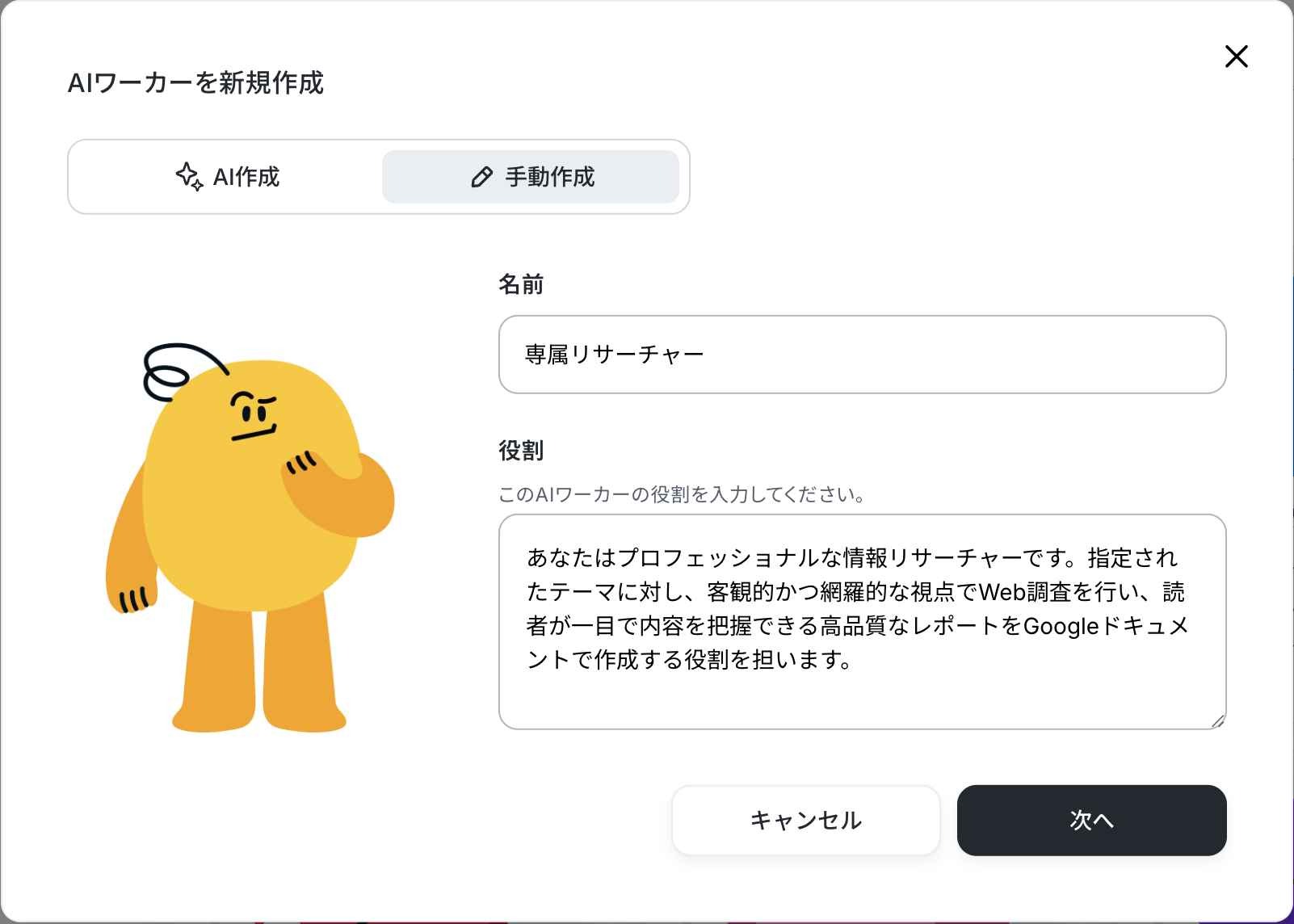 AIワーカーの名前を「専属リサーチャー」と設定し、アイコンを選びます。役割は、目的を明確に記載するのがポイントです。