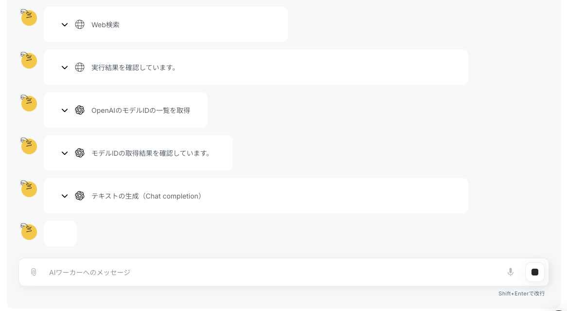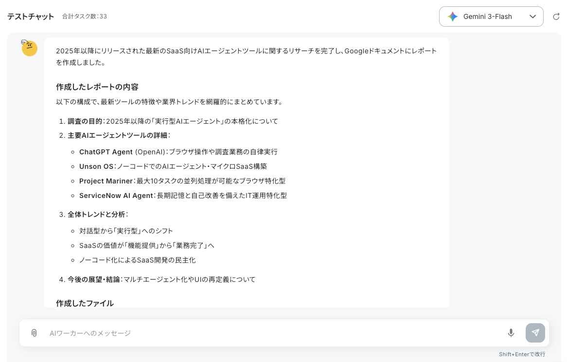 すべての設定が完了したら、いよいよAIワーカーのチャット画面から指示を送信します。