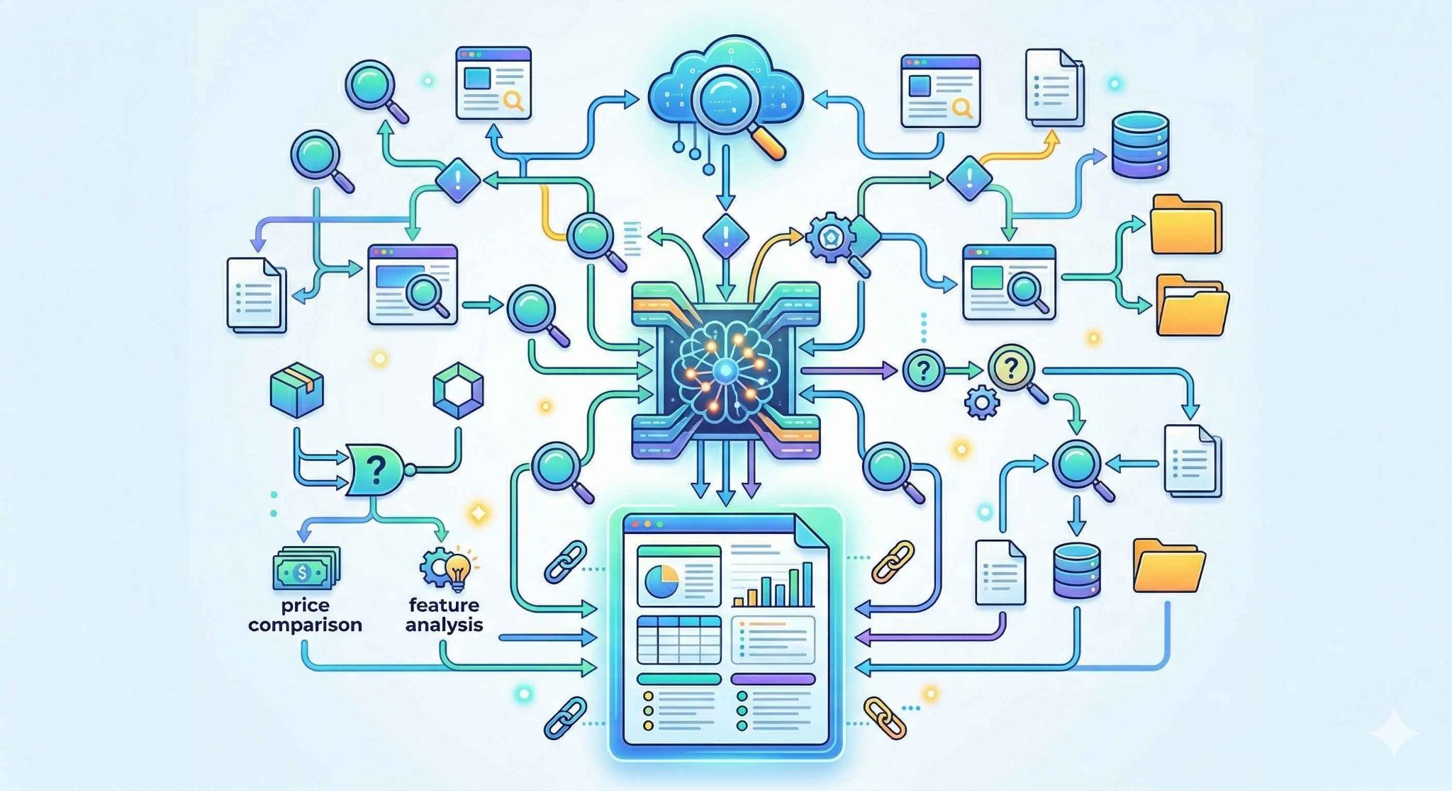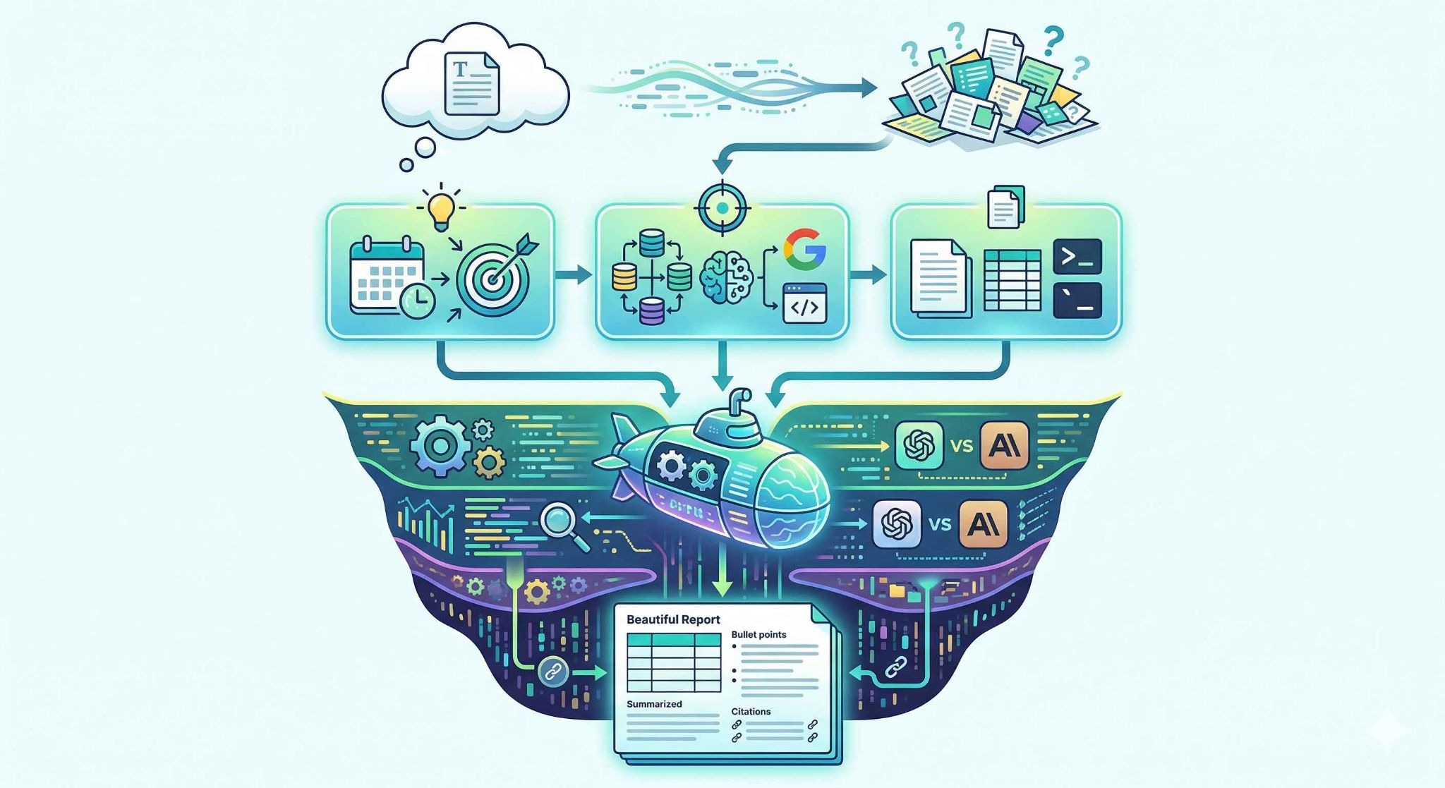 1. 情報収集: 指定された調査テーマに基づいてGoogle検索を実行し、複数の信頼性の高いソースから関連情報を収集します。