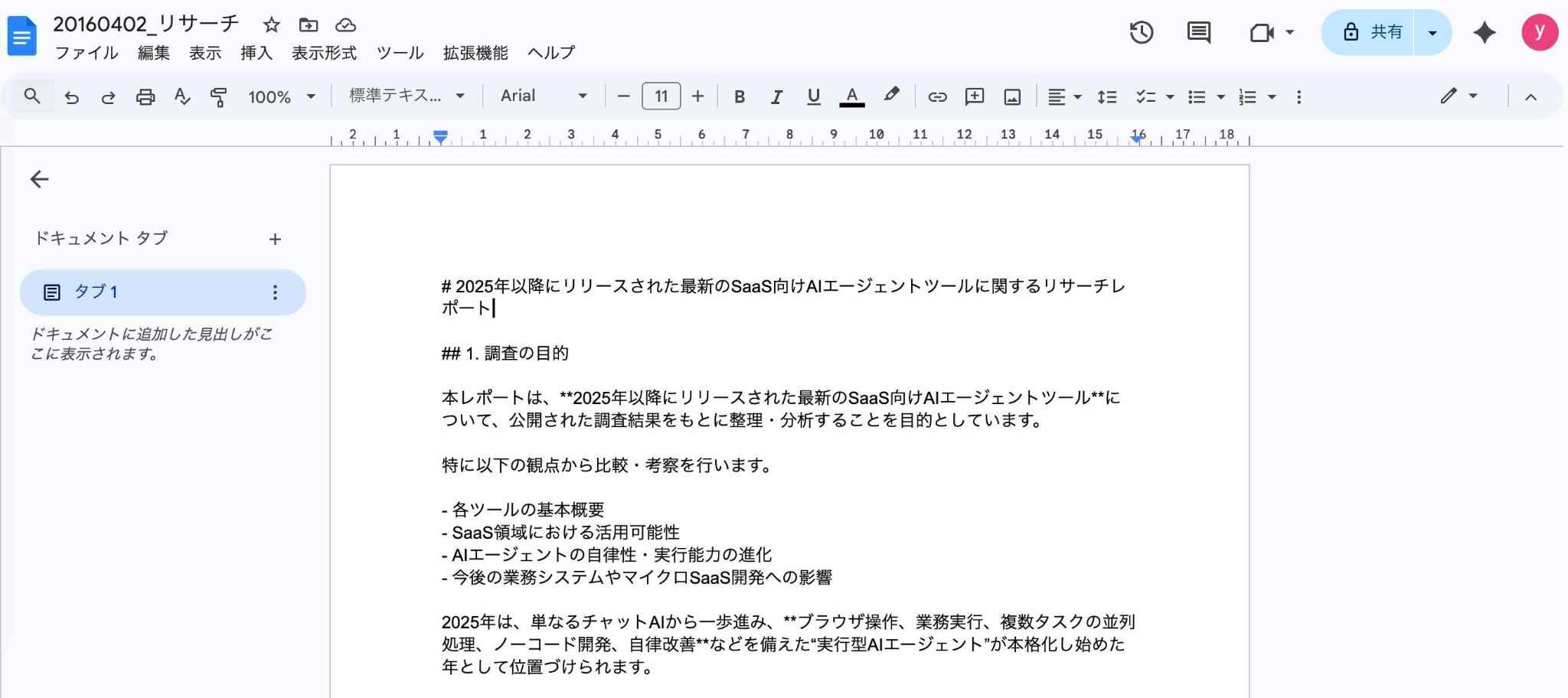 指定されたテーマについてWeb上の情報を収集・分析し、その結果を構造化されたレポートとしてGoogleドキュメントにまとめます。