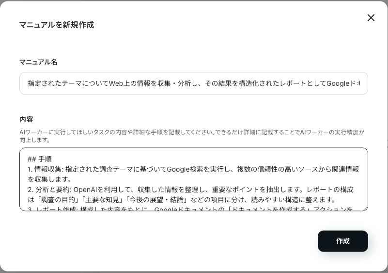 一方、Yoomで作成したAIワーカーは、マニュアル通りにGoogle検索で情報を拾い、OpenAIで分析したうえで、最終的にはGoogleドキュメントへ構造化されたレポートを自動生成します。あらかじめ決めた手順を一気に完了させるため、日常のルーチン調査を手早く片付けたい場面に向いています。