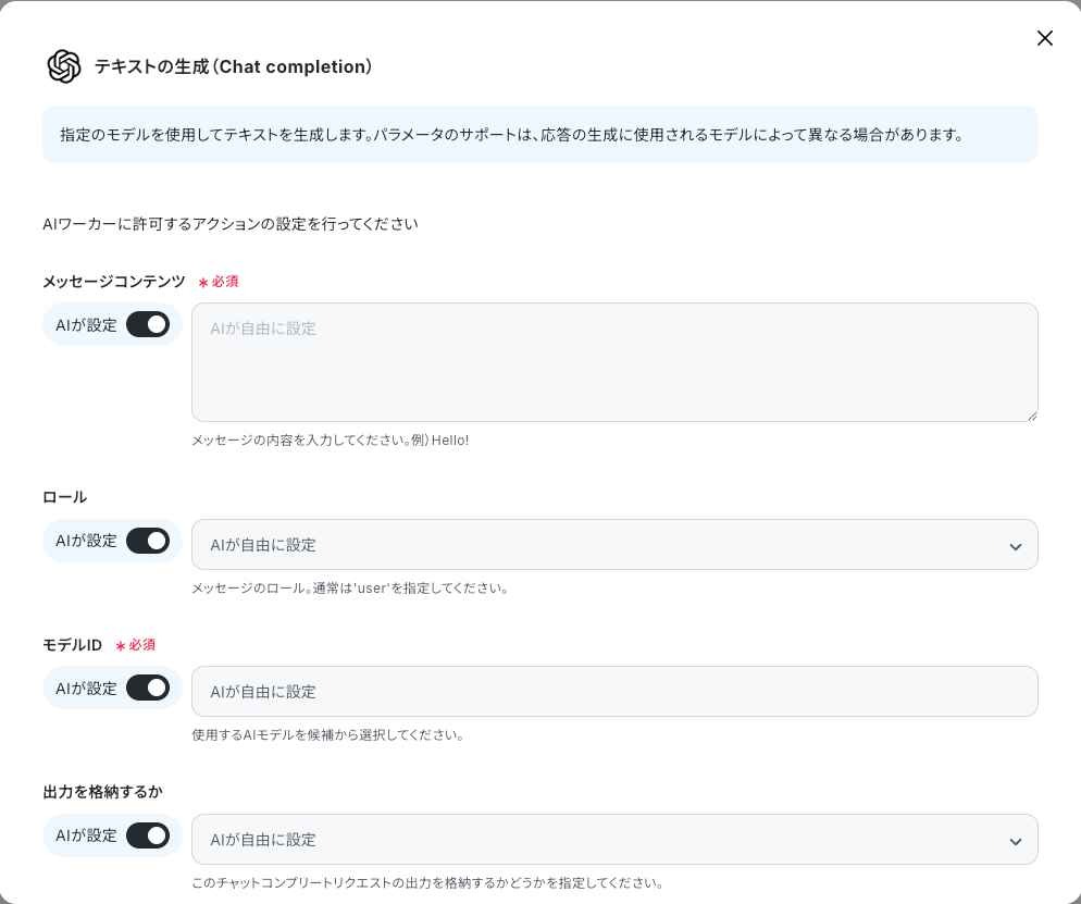 モデルIDなど、必要に応じて変更可能です。この記事ではAIワーカーに任せる設定で保存しています。