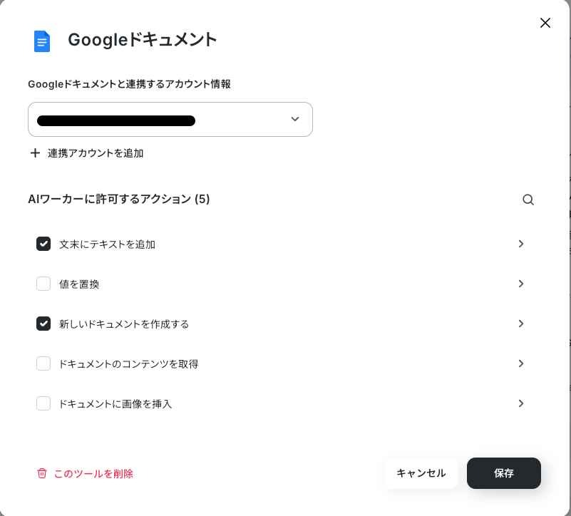 「+ツールを追加」から、Googleドキュメントを検索して追加します。