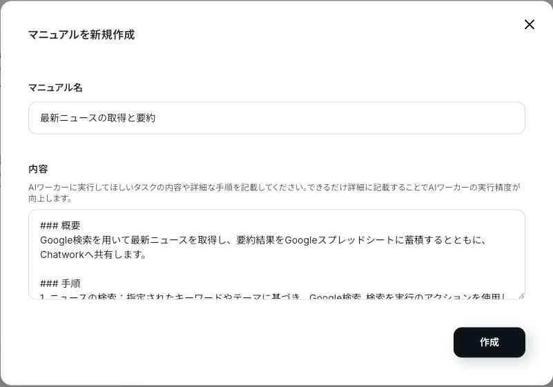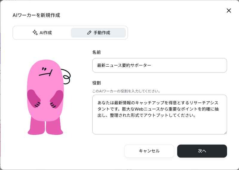 「AI作成」「手動作成」から「手動作成」を選択し、AIワーカーの名前を「最新ニュース要約サポーター」にして、アイコンを選びます。