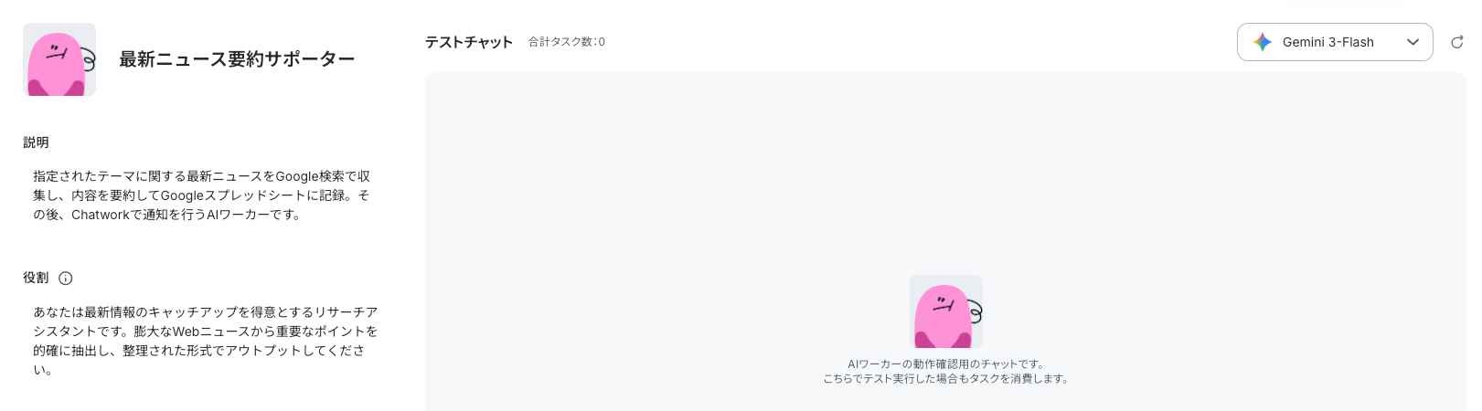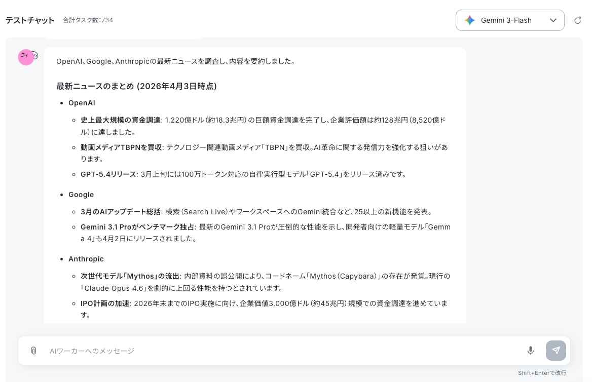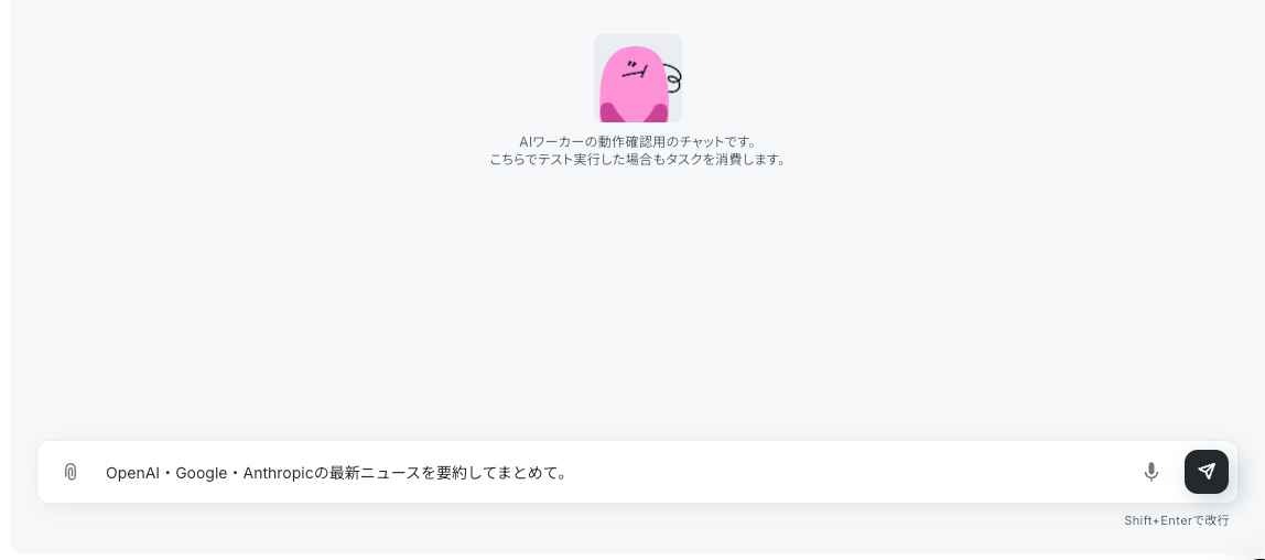 すべての設定が完了したら、AIワーカーのチャット画面から指示を出します。