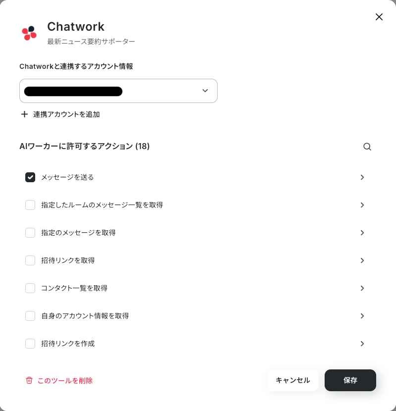 AIワーカーが情報を集めるために必要なツールを紐づけます(この記事ではGoogle検索・Google スプレッドシート・Chatwork)。