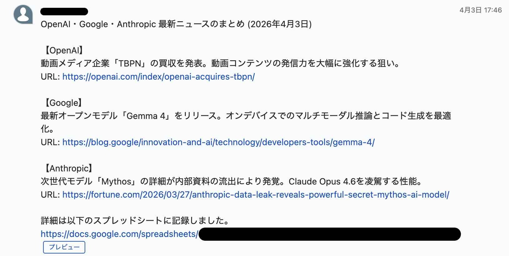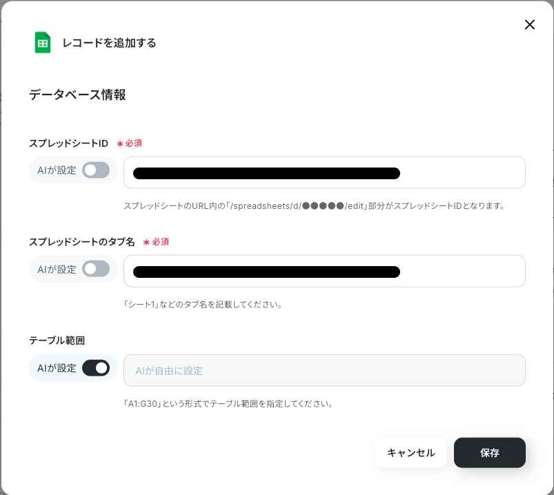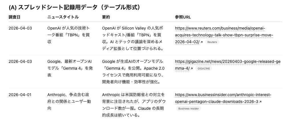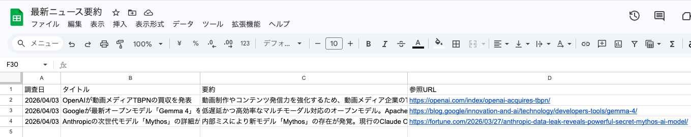 3. スプレッドシートへの記録:Googleスプレッドシート_行を追加のアクションを使用して、調査日: {{日付}}, タイトル: {{タイトル}}, 要約: {{内容}}, 参照URL: {{URL}}へ書き込みます。