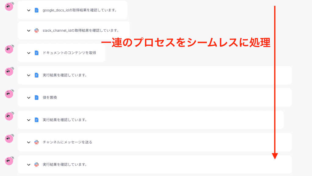 「CRMで顧客情報を取得→必要なドキュメントを作成→社内チャットに共有」といった一連の流れを、一人で完結させる能力を持っているのがAI社員の強みとなっています。
