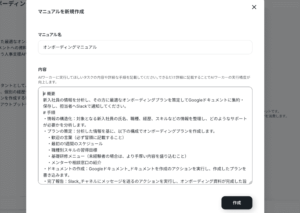 続いて、AIワーカーが迷わず高いクオリティで仕事を進められるよう、業務の進め方やルールを「マニュアル」として登録します。