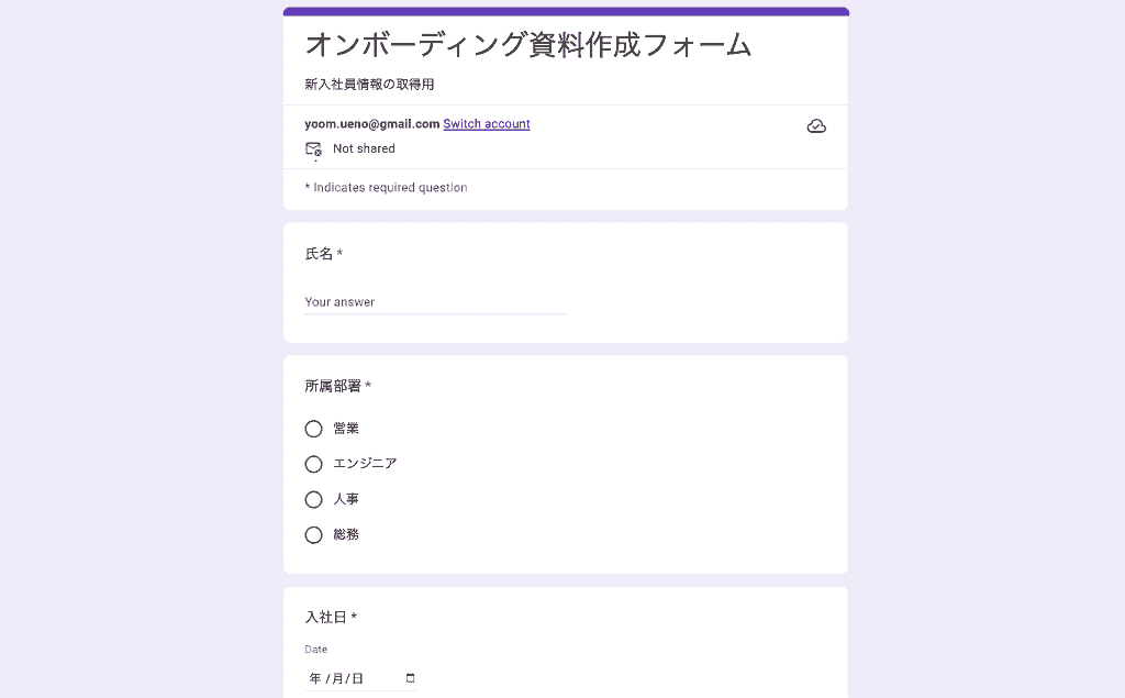 今回は基礎的な個人情報の項目でフォームを構成していますが、たとえば、「営業もしくはCSの経歴」「〇〇ツールの使用歴の有無」の項目をフォーム内に組み込むのもいいでしょう。そうすることでより個人に合ったオンボーディングを組めるようになります。