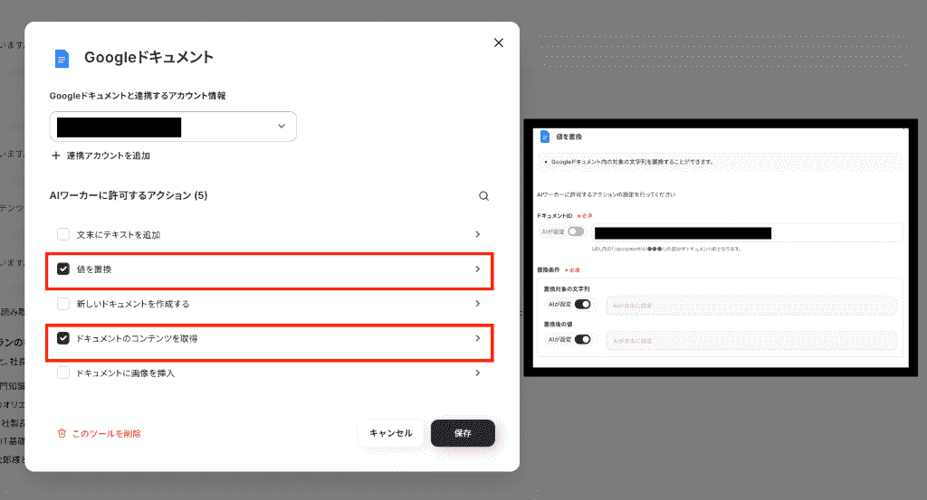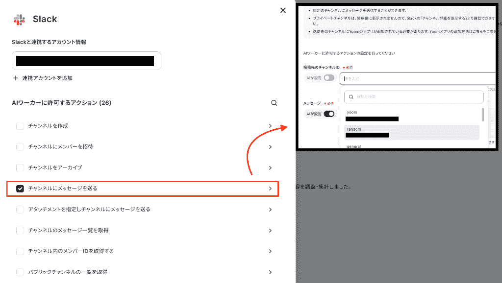 各アクションの出力先はAIに選んでもらうこともできますが、画像のようにトグルをOFFにして入力バーをクリックすると、出力先を決められます。(情報を手入力してもOK)