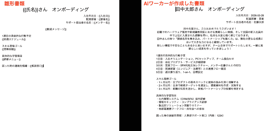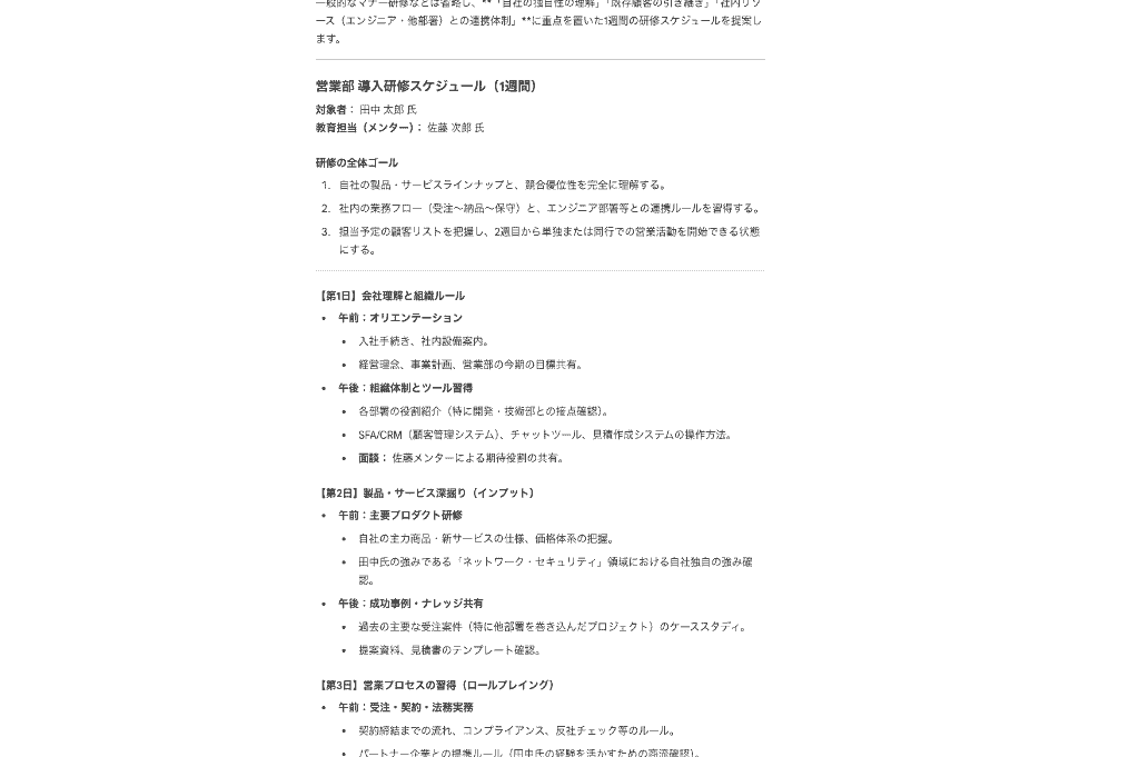 「未経験者には手厚い基礎研修を盛り込むこと」や「必ず歓迎の言葉から書き始めること」など、細かなニュアンスも記載しておくことで、手戻りのない完璧な資料を生成してくれるようになります。