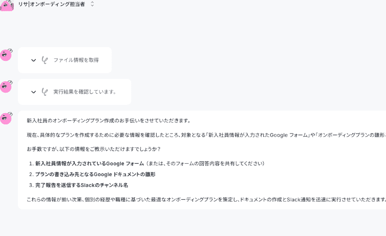 再度処理を行ってくれた結果、設定されたマニュアルに従って自律的にフォームの回答情報を取得し、最適な研修内容を考えてくれました!
