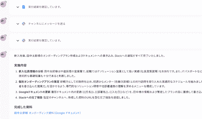 新入社員の情報を分析し、その方に最適なオンボーディングプランを策定してGoogleドキュメントに集約・保存し、担当者へSlackで通知してください。