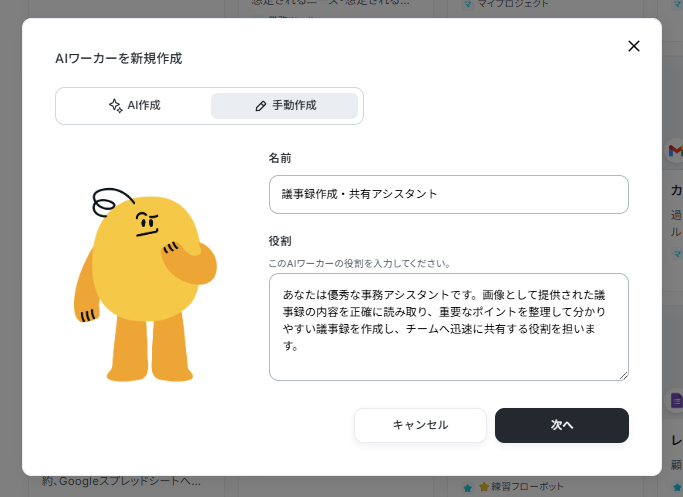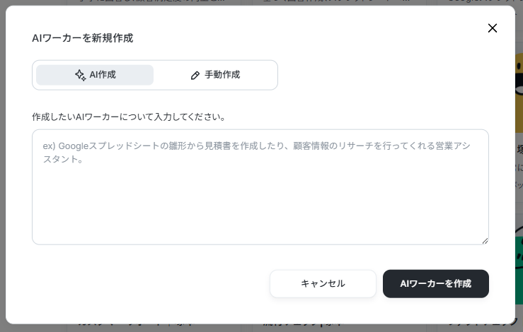 AIワーカーの概要を作成する際は、AIによる作成と手動による作成を選択できます。