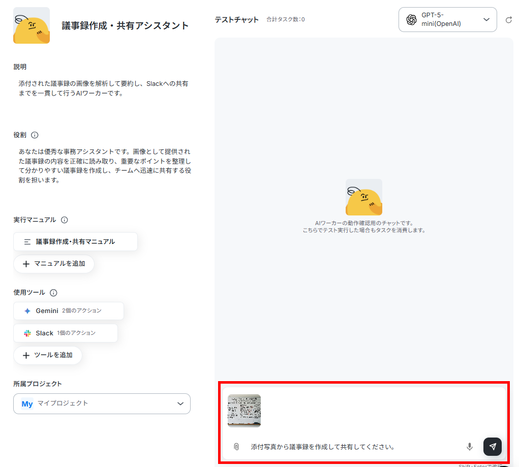 ここでは、先ほど作成したAIエージェント(AIワーカー)と、単一のAI(ChatGPTのみ)を手作業で使った場合とで、使い勝手や業務効率にどのような違いがあるかを比較します。同じ会議内容をまとめた写真から議事録を作成してみて、自動化の度合いについて検証結果をまとめました。