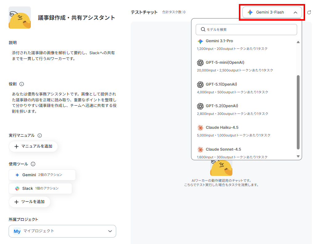 メインとなるAI(今回はChatGPT)は、右上のAIモデルを切り替えることで設定可能です。Gemini・ChatGPT・Claudeの一部のモデルから選択できます。