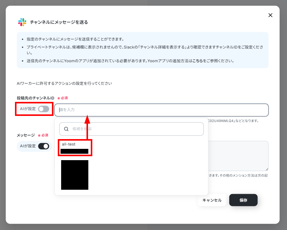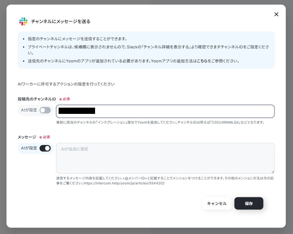 メッセージ内容を直接入力すると、固定のメッセージが毎回通知されます。今回は、毎回異なる議事録を通知してもらうため、AIによる設定にしました。設定が完了したら保存してください。