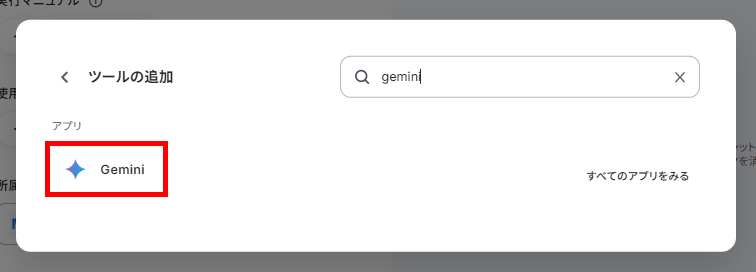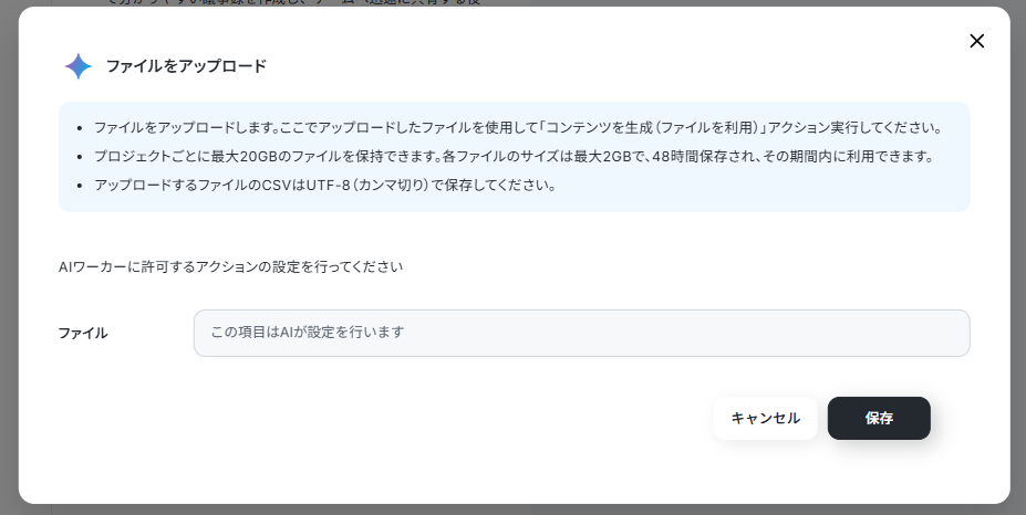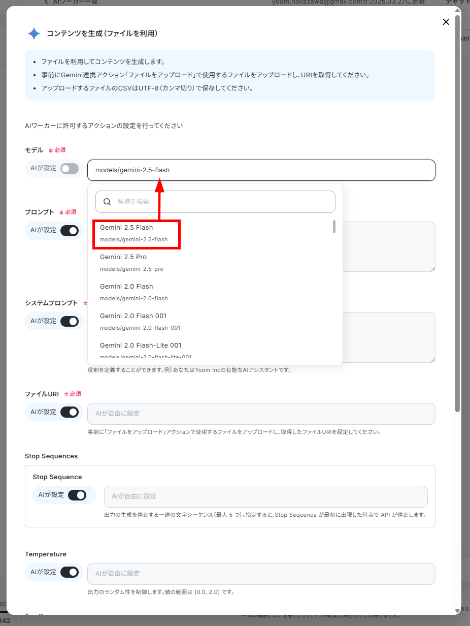 AIワーカーがGeminiを利用する際のアクションを制御する画面が表示されます。今回は、「モデル」のみ指定し、他の項目はメイン処理をするAIに任せています。設定が完了したら保存して、次のツールの連携に進んでください。