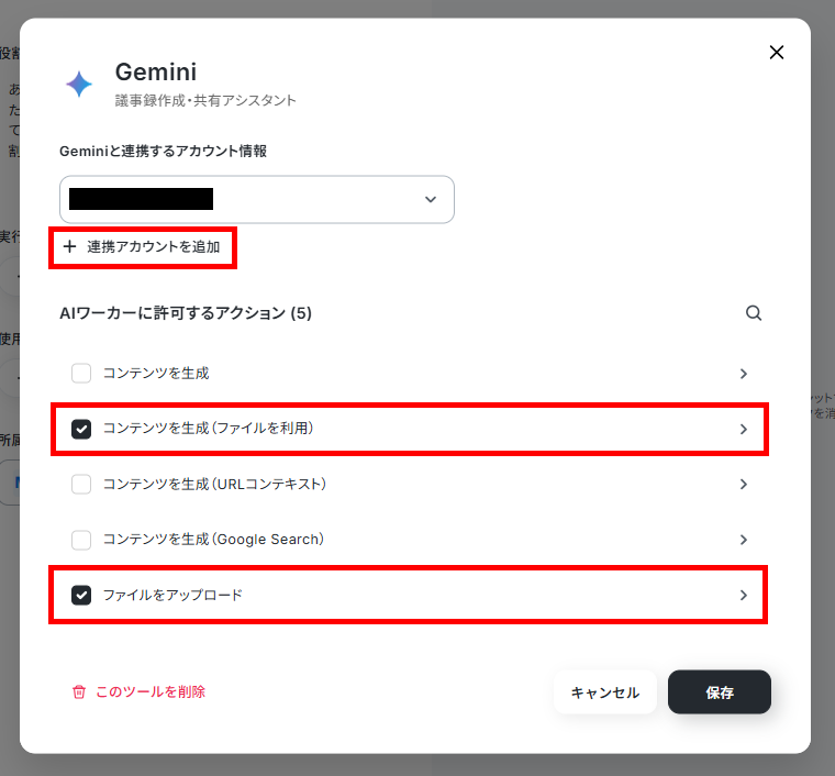連携するアカウントを確認してください。未連携の場合や別のアカウントを利用する場合は、アカウントの追加が必要です。AIワーカーに許可するアクションとして、「コンテンツを生成(ファイルを利用)」と「ファイルをアップロード」を選択し、「>」をクリックします。
