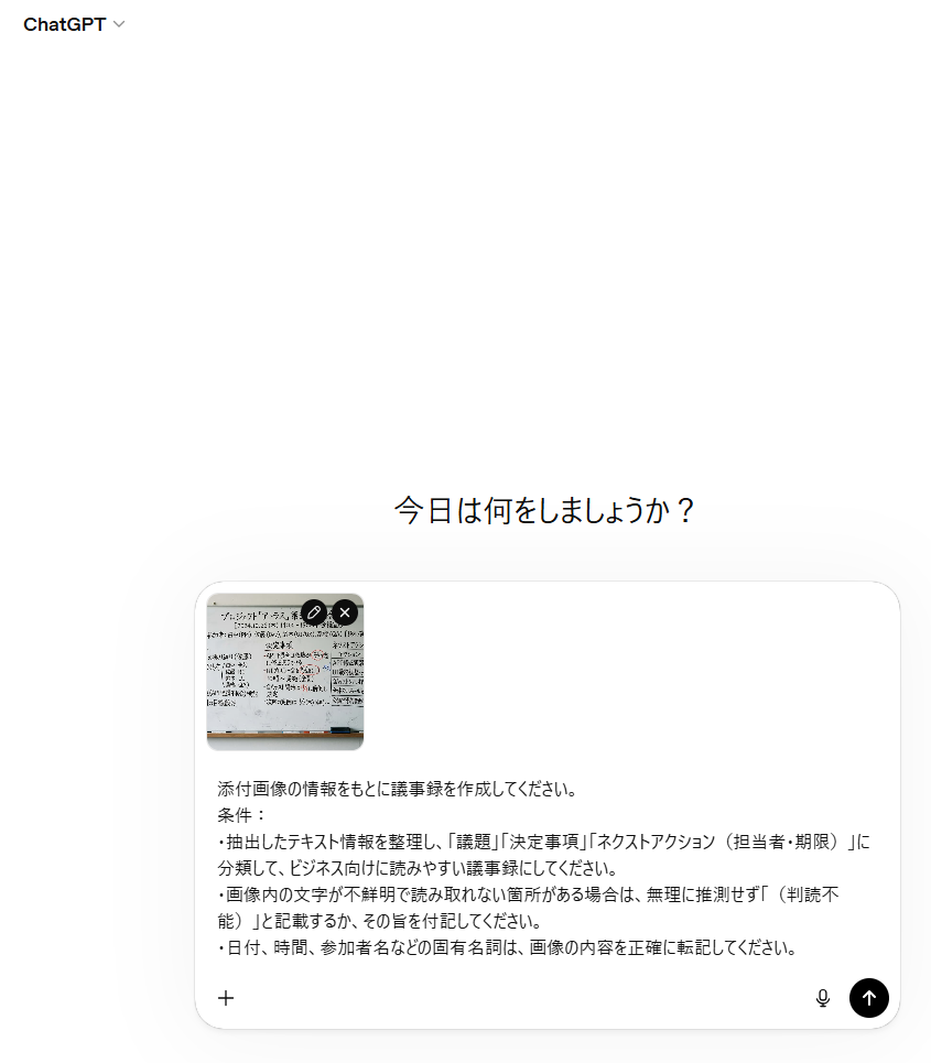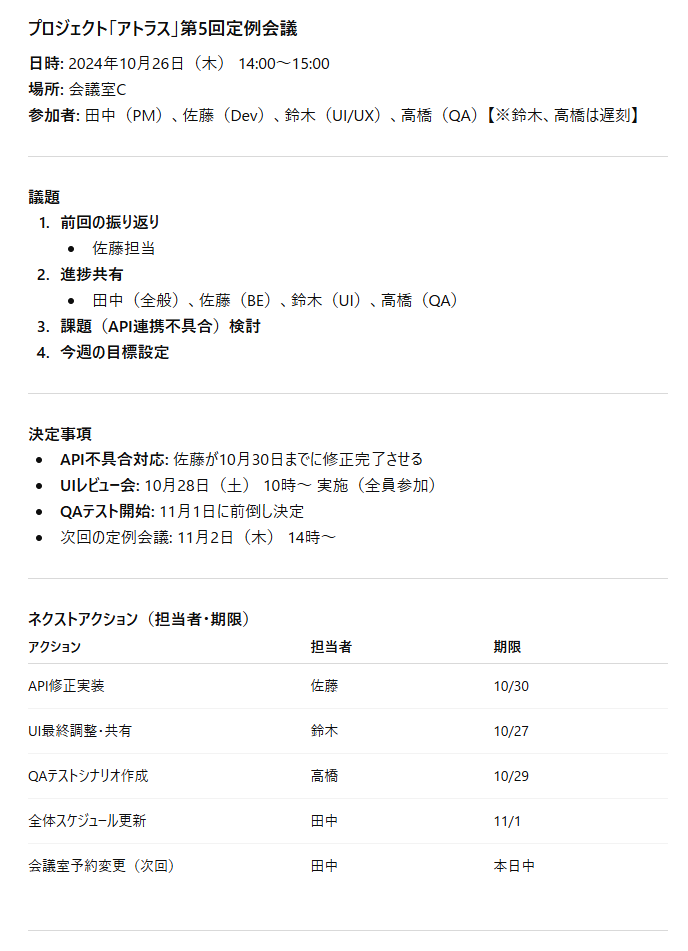 - 抽出したテキスト情報を整理し、「議題」「決定事項」「ネクストアクション(担当者・期限)」に分類して、ビジネス向けに読みやすい議事録にしてください。
