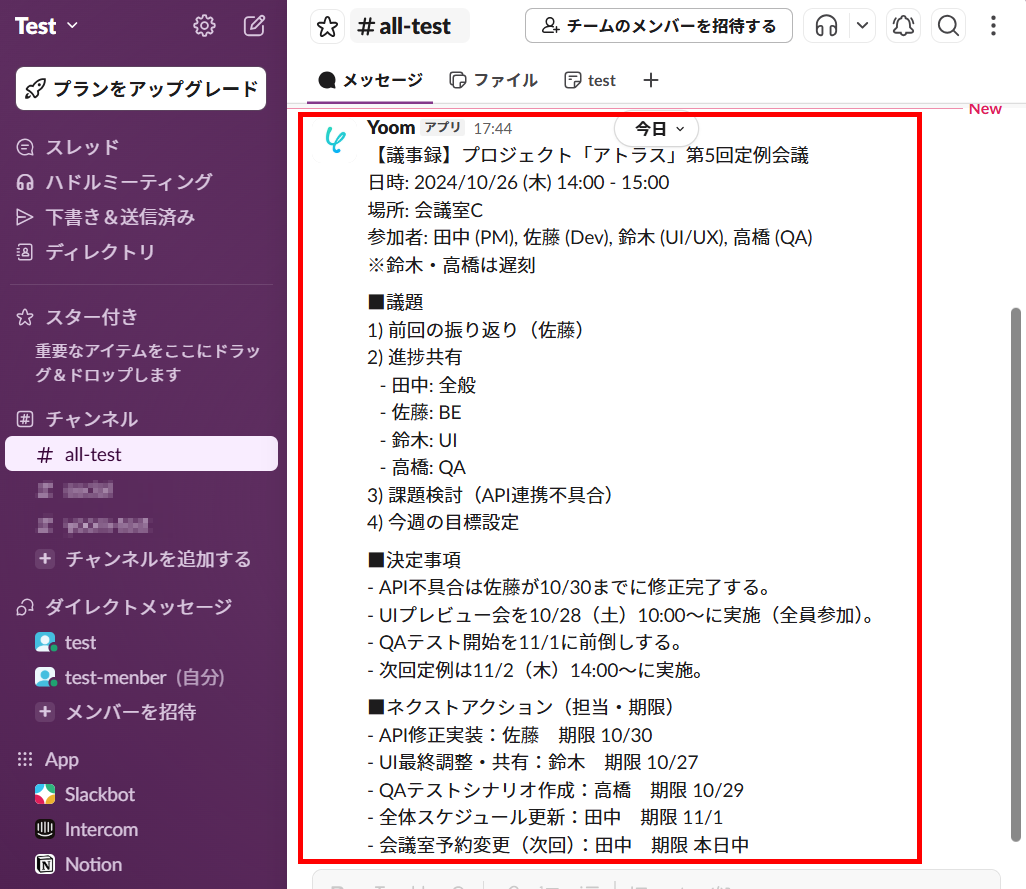 - Slackへの投稿:作成した議事録を、Slackの指定チャンネルへ投稿してください。