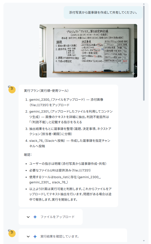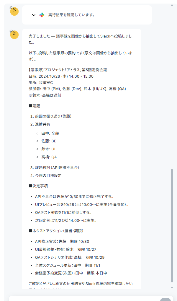 プロンプトを送信すると、連携したツールを使って画像の解析と議事録の作成、そして共有が行われ、約1分20秒でタスクが完了しました。