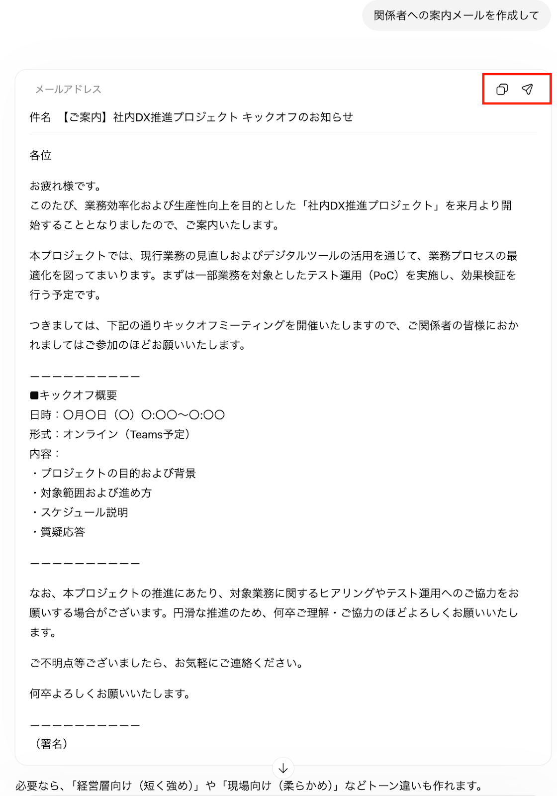※利用するデバイスやアプリ版、あるいは外部連携ツールの設定によっては、赤枠右側のボタンから生成した文章を直接メール作成画面へ引き継ぐことも可能です。