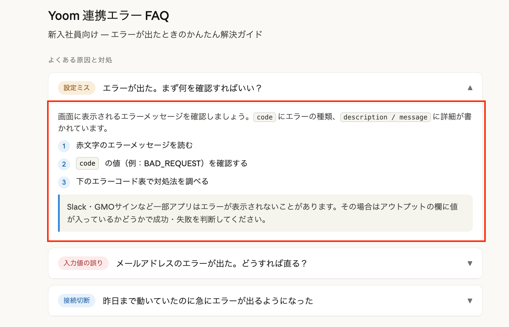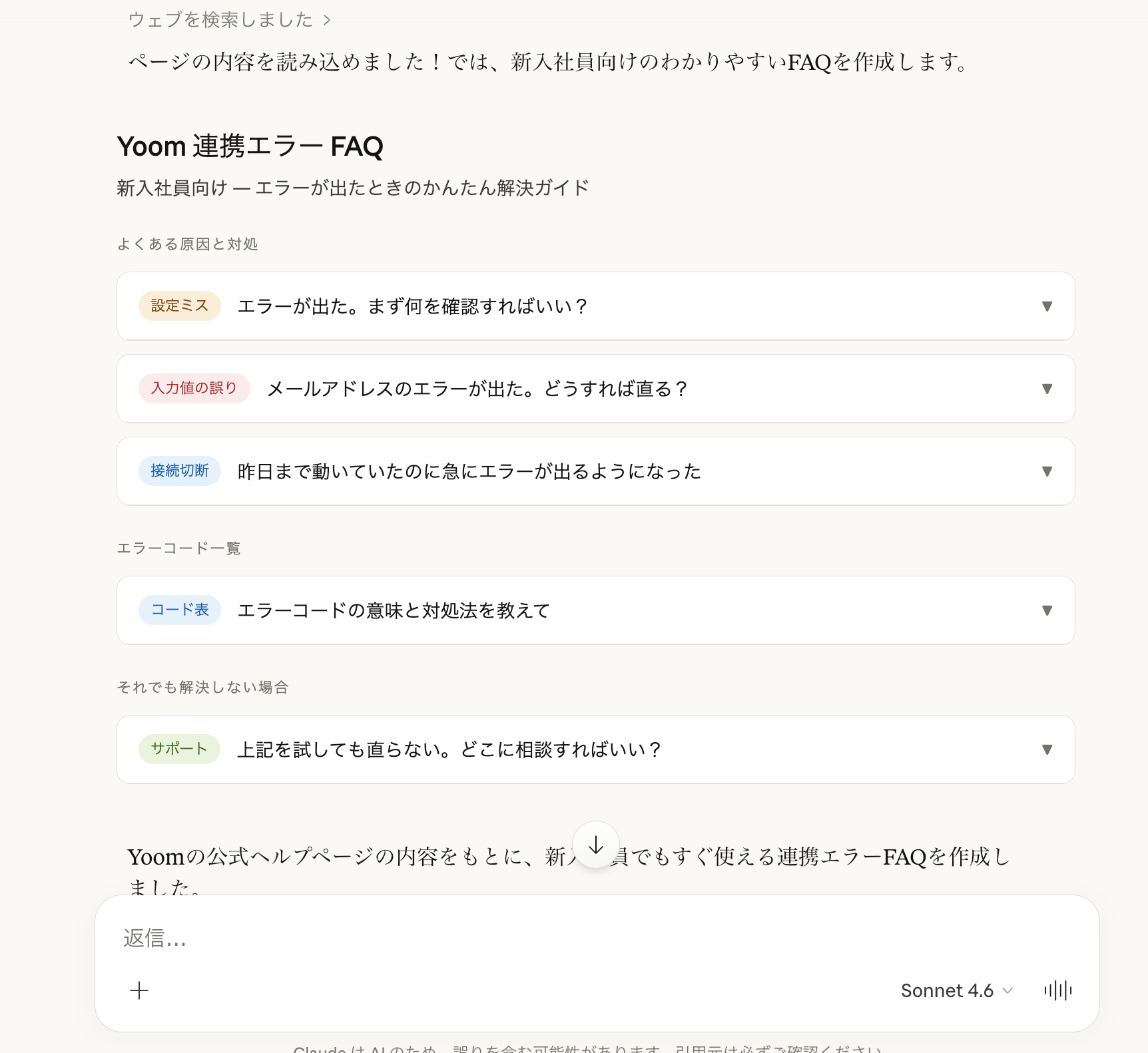 ・ClaudeにYoomのヘルプページを読み込ませ、新入社員向けのトラブルシューティングを作成させてみた Claudeの推論力と長文処理能力を活かし、自社ヘルプページから新入社員向けのトラブルシューティングを作成してもらう検証を行いました!