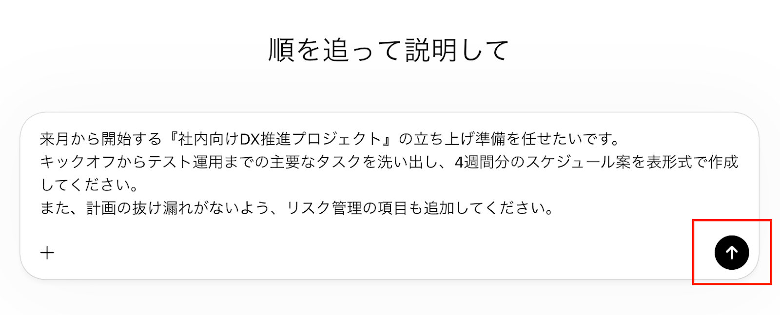 検証手順 まずはChatGPTを立ち上げて画像のような指示を入力し、赤枠のボタンをクリックします。