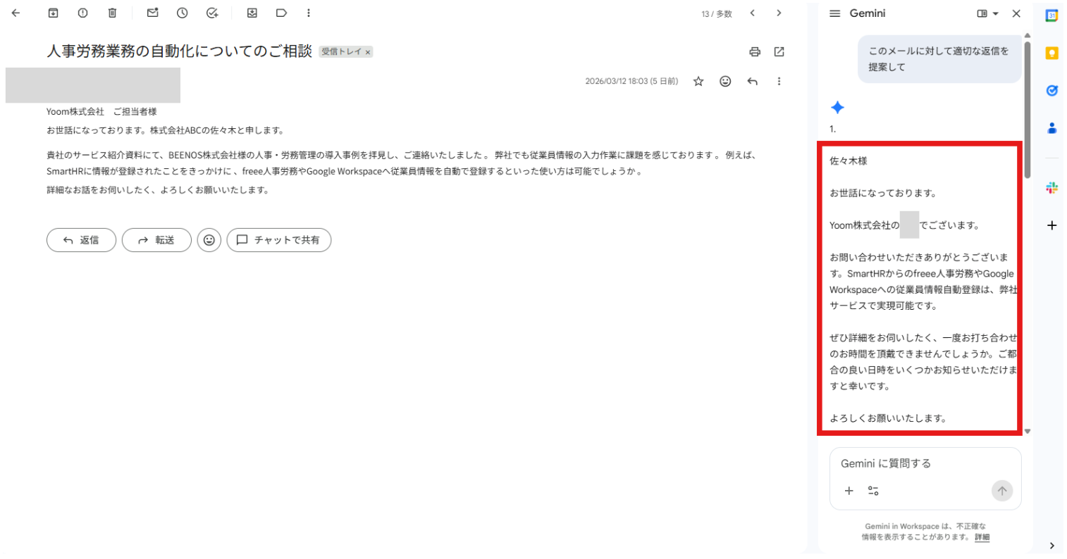次に、「このメールに対して適切な返信を提案して」と指示します。すると、返信文案がGeminiから返ってきました!