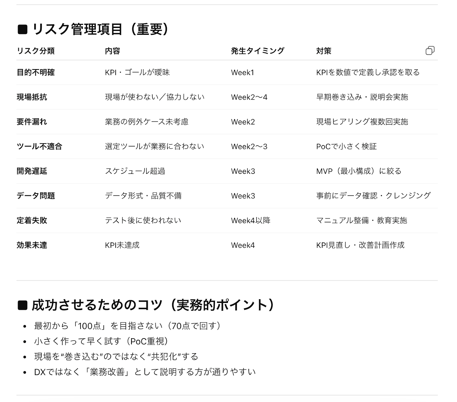 もちろん指示した通りリスク管理項目までまとめてくれてます!