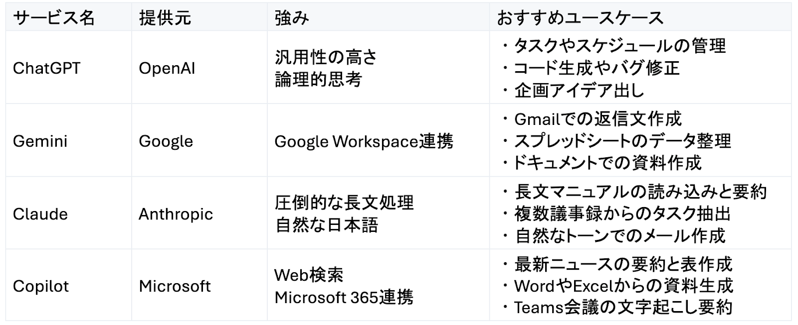 ⚖️代表的なAIアシスタントの比較 市場には数多くのAIアシスタントが存在しますが、それぞれに得意分野や特徴があります。ここでは代表的な4つのツールをご紹介します。