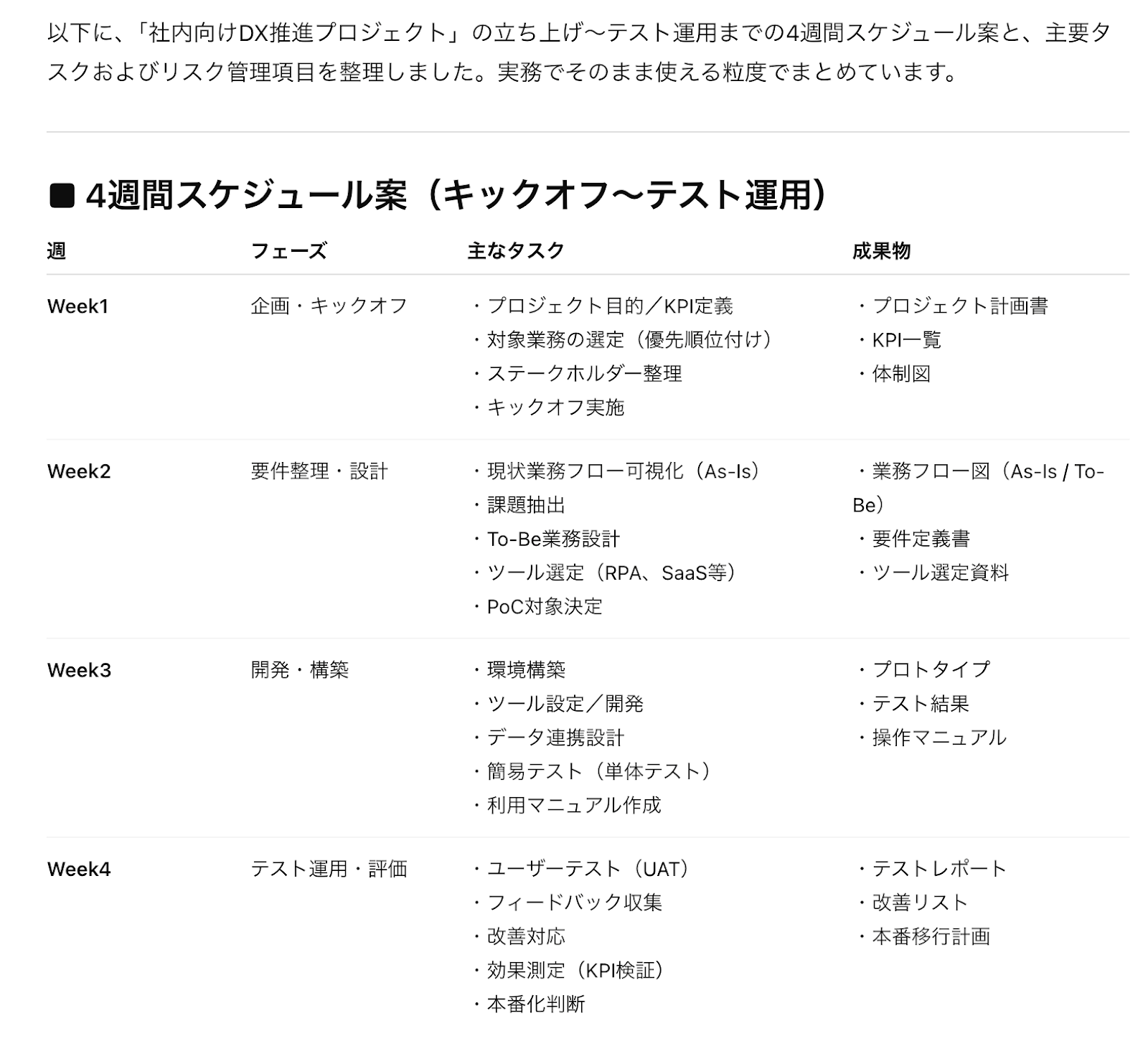 検証結果 論理的なタスク管理が得意なChatGPT。簡単なプロジェクトの目標を入力するだけで、企画からテスト運用までの工程を、抜け漏れのない見事な表形式のスケジュールとして出力できました。さらに、文脈を保ったまま「関係者へのキックオフ案内メール」を作成させると、スケジュールの内容を的確に反映した実用的なビジネスメールが即座に完成します。